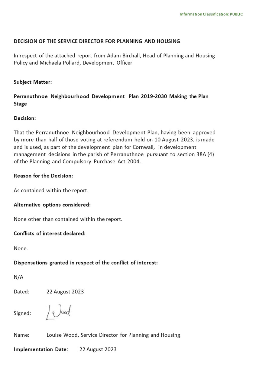 The Neighbourhood Plan was therefore adopted by Cornwall Council as the formal planning document for the Parish on 22nd August 2023. It has the same legal status as the Cornwall Local Plan and must be used for all development planning decisions in the Parish of Perranuthnoe until 2030.