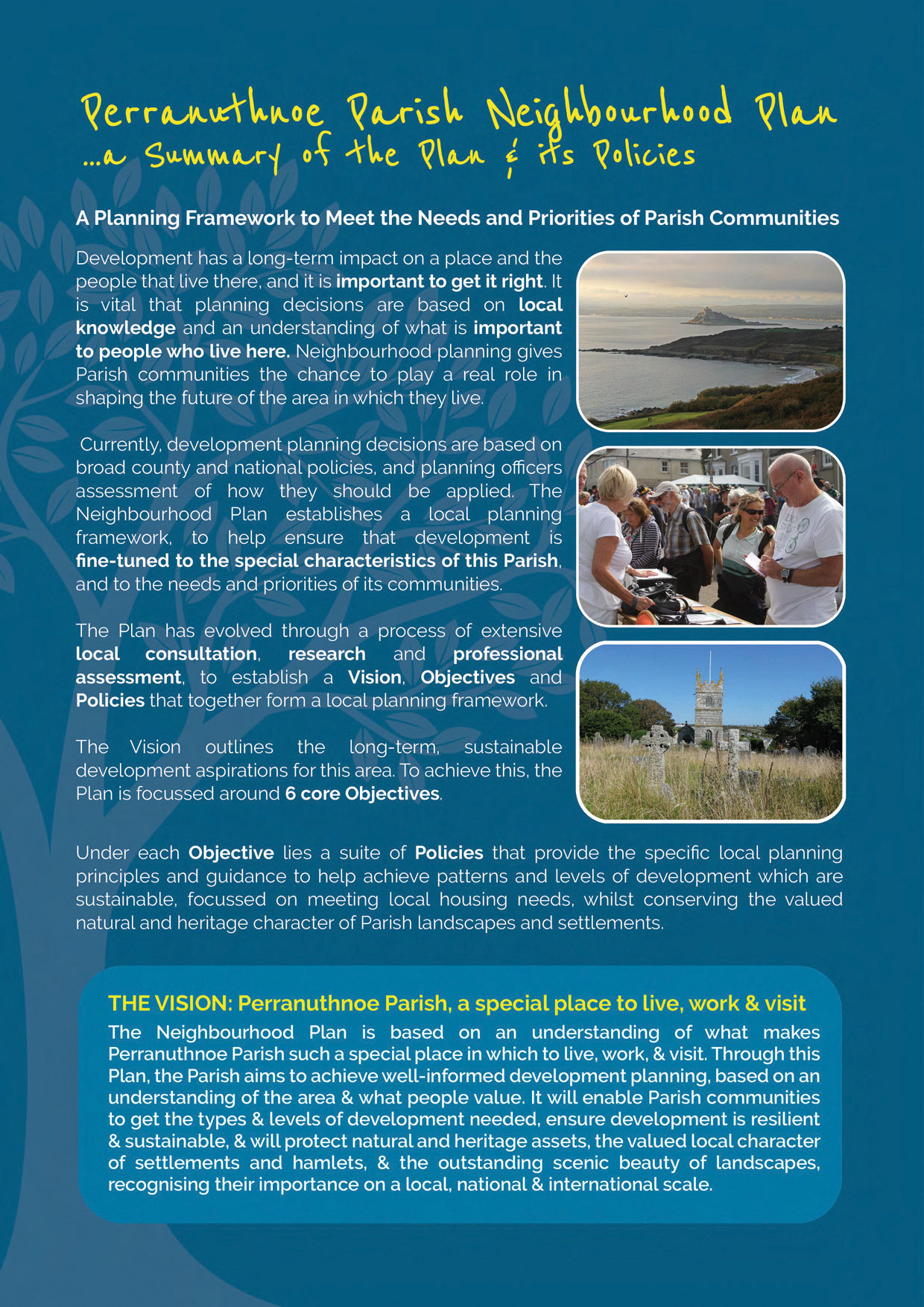 The Perranuthnoe Neighbourhood Plan provides a Local Planning Framework to help achieve development that is fi ne-tuned to meet the needs and priorities of this Parish and the people that live here.